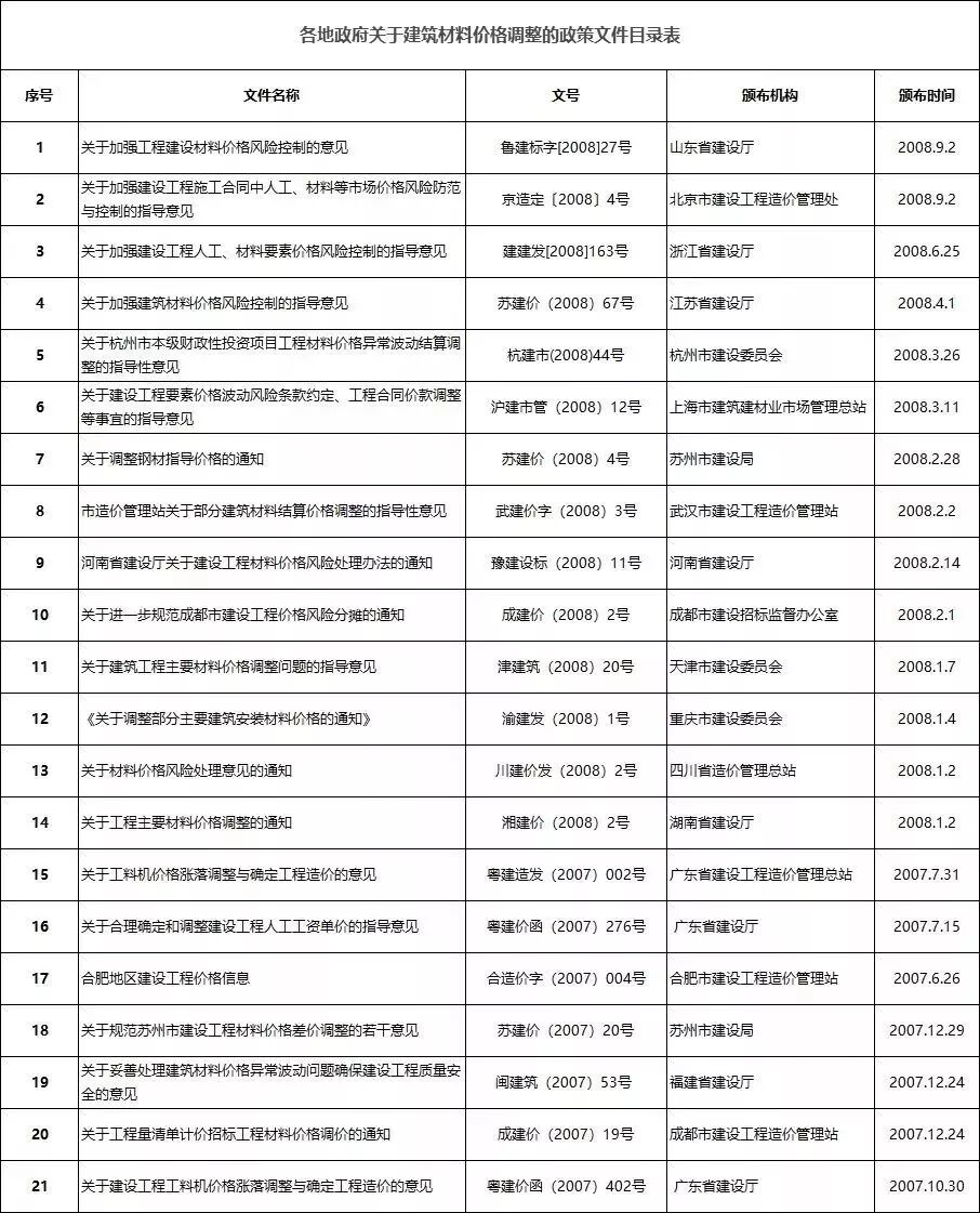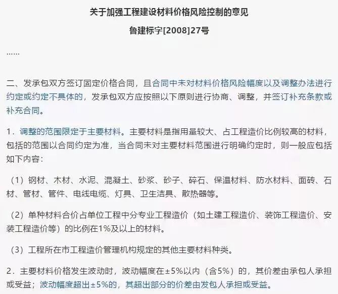 其实早在2007、2008年,因人工、材料、台班价格出现持续大幅度的涨落,全国多个省份已出台文件,就“合同中未明确或强行约定承包人承担全部风险”的问题作出明确规定,要求发承包双方需签订补充协议,进行价差调整。