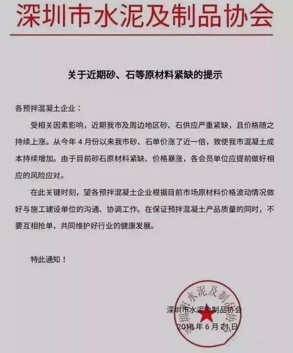 受全国范围内环保整治风暴影响,深圳市及周边地区砂石供应紧张且市场价格普遍上涨,导致混凝土行业生产成本持续增加。