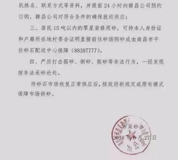 三、居民15吨以内的零星装修用砂,可持本人身份证和户籍所在地村委会证明直接前往砂场购砂或由南昌市平价砂石配送中心保障(88397777)。