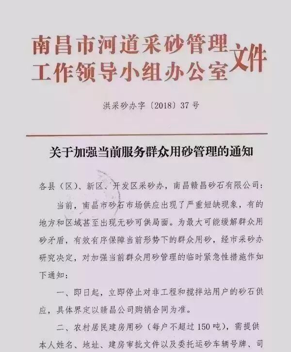 南昌市砂石市场供应出现了严重短缺现象,有的地方和区域甚至出现无砂可供局面。为最大可能缓解群众用砂矛盾,有效有序保障当前形势下的群众用砂,经南昌市采砂办研究决定:
