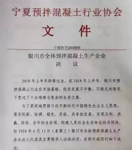 6月25日,宁夏混凝土行业协会发布《银川市全体预拌混凝土生产企业决议》: